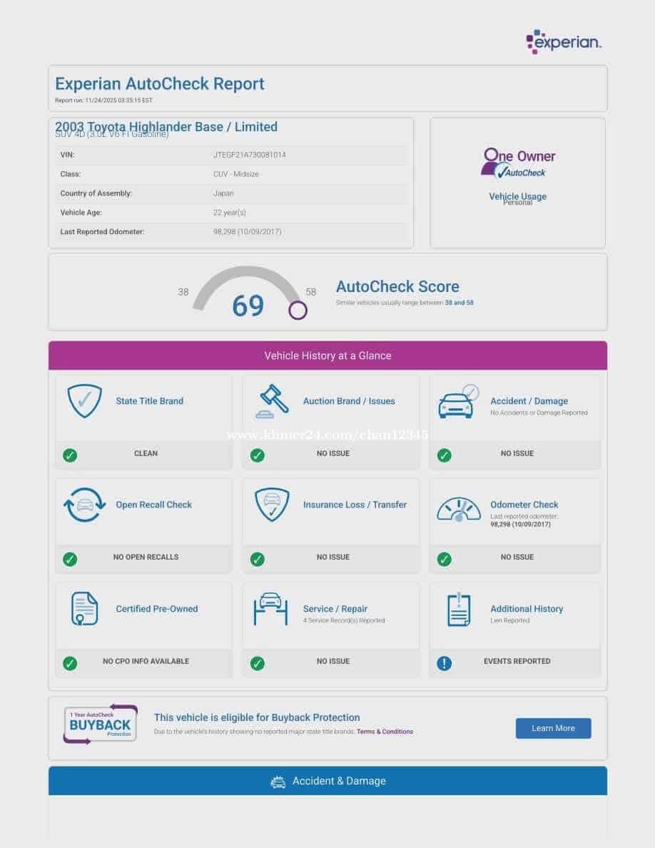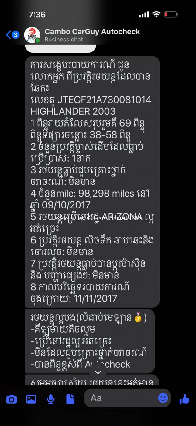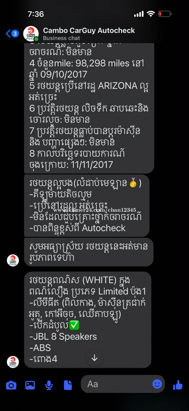 ឡានស្អាតអត់បុកអត់ច្រេះ ឆ្នាំ2003 ម៉ាសុីន6 ប៉ុង1 limited full ពណ៍ ស ទឹកថ្នាំហ្សីនស្អាត ភ្លឹរលោង ម៉ាសុីនស្ងាត់ ខ្លាំង ប្រអប់លេខដំណើកាល្អ ខាងក្នុលឿង ថ្មី ពូកស្បែក កំ បូលបើក ម៉ាញ៉េ JBL ចង្កៀងគុជ បាតថ្មីជើងក្រោមហាប់ សំបកកង់ថ្មី ធានាឡានស្អាត អត់បុក អត់កាត់ត អត់ប្តូពណ៍ ទីតាំង ភ្នំ ពេញ ចោមៅ