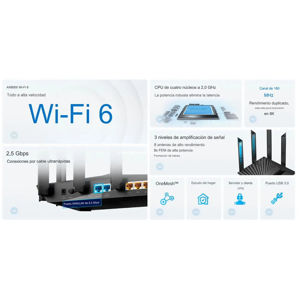 tp-link Wi-Fi 6 Router Model: Archer AX80 AX6000 8-Stream Wireless : 4804 Mbps (5 GHz-1)+ 2402 Mbps (5 GHz-2)+ 574 Mbps (2.4 GHz) Processor : 1.7 GHz Quad-Core CPU Antennas : 6x High-Performance Antennas Ethernet Ports: 1x 2.5 Gbps WAN/LAN Port + 1x Gigabit WAN/LAN Port + 3 x Gigabit LAN Ports Working Modes: Router Mode, Access Point Mode Power : 12 V 3.3А USB Ports : 1x USB 3.0 Port Price : 140$ __________________________________ - ធានាគុណភាពជូនអតិថិជន - សេវាកម្មល្អផ្ដល់នៅទំនុកចិត្ត - សេវាកម្មដឹកជញ្ជូន25ខេត្តក្រុង - Phone : 0966568xxxClick To Call | 0882016xxxClick To Call - Join Telegram Group : https://t.me/pscomputer98 - Chat Telegram : https://t.me/+855882016198