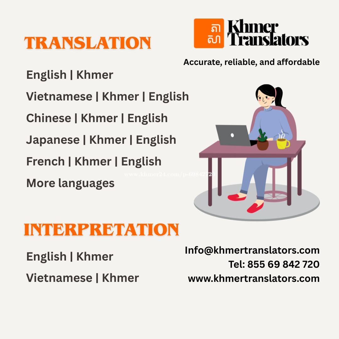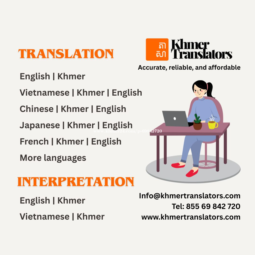 Khmer Translators ទទួលបកប្រែឯកសារគ្រប់ប្រភេទ៖ - កិច្ចសន្យាអាជីវកម្ម កិច្ចសន្យាទិញ-លក់ និងជួល - សៀវភៅ គេហទំព័រ កម្មវិធីទូរសព្ទ និងសៀវភៅណែនាំការប្រើប្រាស់ម៉ូតូ - ឯកសារដាក់ទៅស្ថានទូត ដើម្បីទៅសិក្សា ឬធ្វើដំណើរកម្សាន្តទៅក្រៅប្រទេស - ឯកសារជាច្រើនប្រភេទទៀត... Khmer Translators offers translation services for all types of documents: • Business contracts, purchase and sale contracts, and lease contracts • Books, websites, apps, and motorcycle owner’s manual • Documents for submission to the embassy for study or travel abroad • Others ប្រសិនបើលោកអ្នកត្រូវការសេវាបកប្រែ សូមទាក់មកយើងខ្ញុំតាមទំនាក់ទំនងខាងក្រោម៖ Tel: +8556984xxxClick To Call0 Email: inf*@khmertranslators.comClick To Sent Email Telegram: https://t.me/khmertranslators WhatsApp: +8556984xxxClick To Call0 Website: www.khmertranslators.com យើងខ្ញុំនឹងផ្តល់ការប្រឹក្សាលើការបកប្រែលម្អិត និងសម្រង់តម្លៃបកប្រែជូនលោកអ្នកដោយឥតគិតថ្លៃ