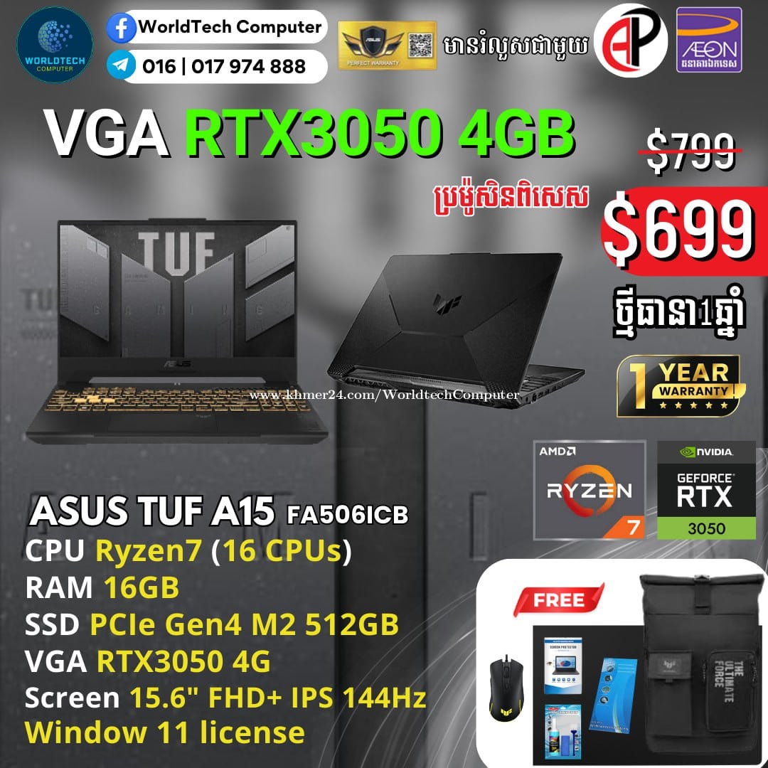 TUF A15 Ryzen7 RAM 16G M2 512GB RTX3050 4G 15.6" 144Hz New=699$ New Warranty 1year -ថែមជូនការដូរ7មុខ បិទScreenជូន Telegram: 017974xxxClick To Call , 011777xxxClick To Call ទីតាំងហាង: ផ្ទះ39Eo ផ្លូវ257 ទឹកល្អក់3 ទួលគោក ភ្នំពេញ (ខាងលិចស្តុបទេពផនប្រហែល 300ម)។ Location: #39E0 St257, Tuol Kouk , Tuek L'ak Bei , Phnom Penh