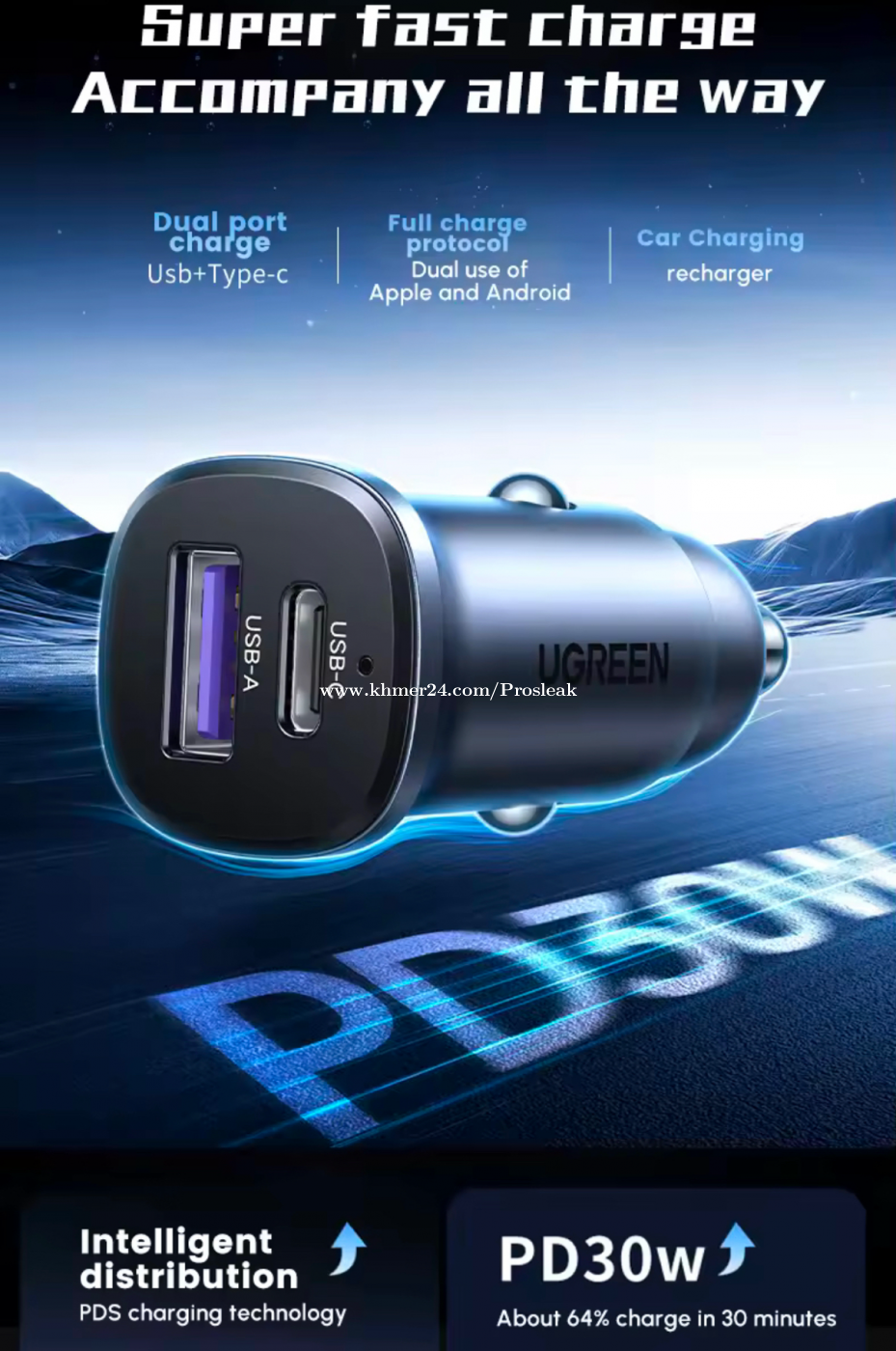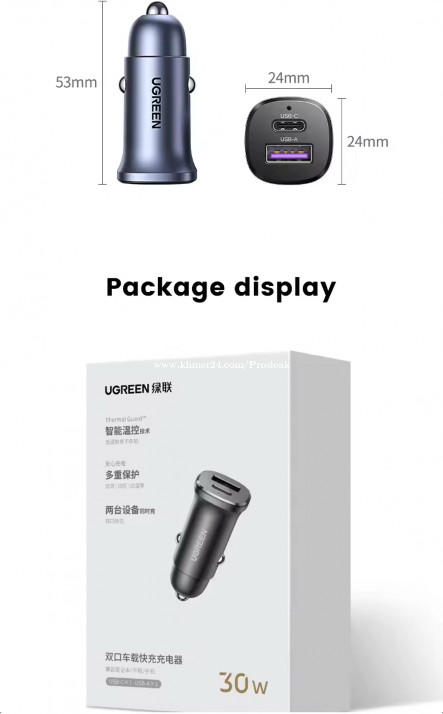 ឧបករណ៍សាកថ្មក្នុងរថយន្តដែលមានPortពីរប្រភេទ — USB‑C (សាកលឿន 30W) និង USB‑A (QC លឿន 22.5W)។ អាចបញ្ជូនថាមពលសរុបប្រហែល ~30W។ • គាំទ្រការសាកលឿន: USB‑C គាំទ្រ USB‑PD 3.0 និង PPS (5–12V ដល់ 2.7A)។ ចំណែក USB‑A គាំទ្រ QC 3.0/4.0 • សាកលឿនជាក់ស្តែង: អាចសាក iPhone 15 ប្រហែល 60% ក្នុងរយៈពេល 30 នាទីតែម្ដង។ • ការពារសុវត្ថិភាព: មានប្រព័ន្ធការពារច្រើន ដូចជា — ការកើនកម្តៅ, ចរន្តលើស, វ៉ុលលើស, រួមទាំងការពារបំពង់ភ្លើង។ • ធន់រឹងមាំ: មានទំហំតូចល្មម ងាយស្រួលភ្ជាប់ក្នុងរថយន្ត (ទំហំ 12V–24V) ហើយផ្នែកខាងក្រៅជាអាលុយមីញ៉ូម ដើម្បីជួយបញ្ចេញកម្តៅបានល្អ។ ☎️☎️ 010468xxxClick To Call, 017795xxxClick To Call Telegram 010468xxxClick To Call