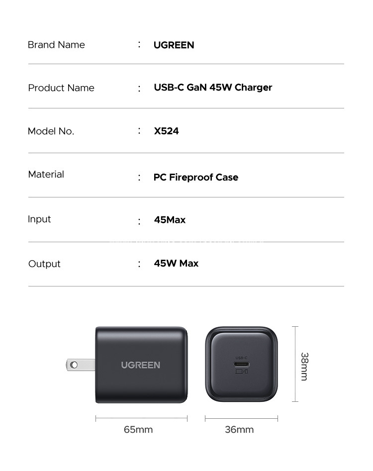 UGREEN 45W USB-C GaN Fast Charger US 65050B ✅ AC input: 100~240 Vac, 50/60 Hz, 1.2A Max ✅ Output:5V/3A 、9V/3A 、12V/3A 、15V/3A 、20V/2.25A 45W Max PPS: 5~11V/4.5A (PDO broadcast 4.5A, actual 4.05A, triggering Samsung ultra-fast charging 2.0) ✅Output Total Power: 45W Max ✅ Support Agreement: USB-C:PD3.0/2.0、PPS、SCP(10V2.25A)、QC3.0(3.6V~12V 18W)、QC2.0(9V/12V 18W)、AFC(9V-max15W)、FCP(9V/12V-max 18W)、APPLE 5V/2.4A、SAMSUNG 5V/2A、BC1.2 (5V/1.5A) 👍2 YEAR WARRANTY *This price not include delivery 🛒កម្ម៉ង់ឥឡូវនេះ 👇👇👇 ផ្នែកលក់ 012787xxxClick To Call https://t.me/cmksale1 Join ⏬ Telegram 🔔 https://t.me/+pMlYdQSBYkEyYTU1 ដើម្បីទទួលបាន ព័ត៌មានថ្មីៗ លម្អិត និងការផ្តល់ជូនពិសេសៗ ពីជួម៉េងគួងកុំព្យូទ័រ 🌐cmkcomputer.com 🌐https://www.facebook.com/MengKourngComputer 🌐https://www.facebook.com/cambodiafantech