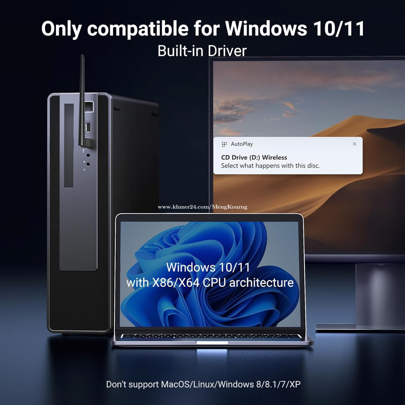 UGREEN AX900 USB High-Gain Dual Band Wi-Fi6 Adapter 35265 ✅ Input Port and Specifications ✅ Wi-Fi operating frequency: 2.4Ghz(2400Mhz~2483.5Mhz)IEEE 802.11 b/g/n/ax / 5Ghz(5150Mhz~5350Mhz 5725Mhz~5850Mhz)IEEE 802.11a/n/ac/ax 2.4Ghz:286Mbps Max 5Ghz :600Mbps Max External Single Antenna, gain of 6 dBi * Monitor Mode Support * Internet Access: Automatically Obtain IP Address (DHCP) / Manually Set IP Address 2 Year warranty (បញ្ជាក់​:តម្លៃ​នេះមិនបូករួមសេវាដឹក​ជញ្ជូននោះទេ។ ) *This price not include delivery 🛒កម្ម៉ង់ឥឡូវនេះ 👇👇👇 ផ្នែកលក់ 012787xxxClick To Call https://t.me/cmksale1 Join ⏬ Telegram 🔔 https://t.me/+pMlYdQSBYkEyYTU1 ដើម្បីទទួលបាន ព័ត៌មានថ្មីៗ លម្អិត និងការផ្តល់ជូនពិសេសៗ ពីជួម៉េងគួងកុំព្យូទ័រ 🌐cmkcomputer.com 🌐https://www.facebook.com/MengKourngComputer 🌐https://www.facebook.com/cambodiafantech