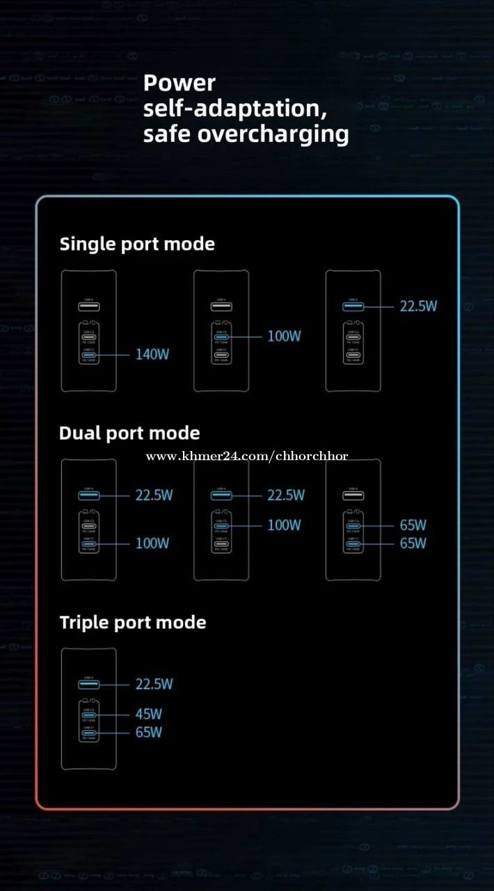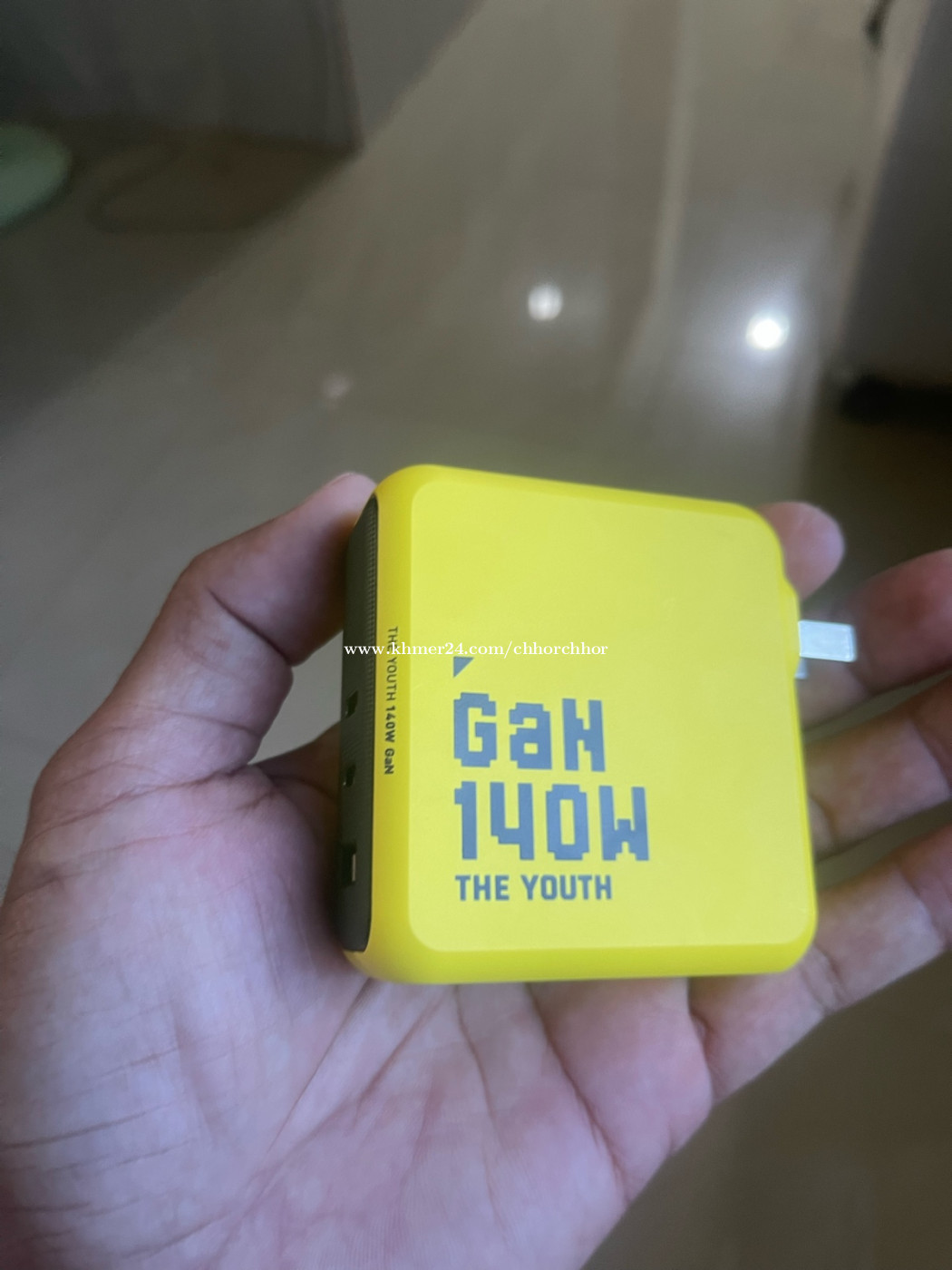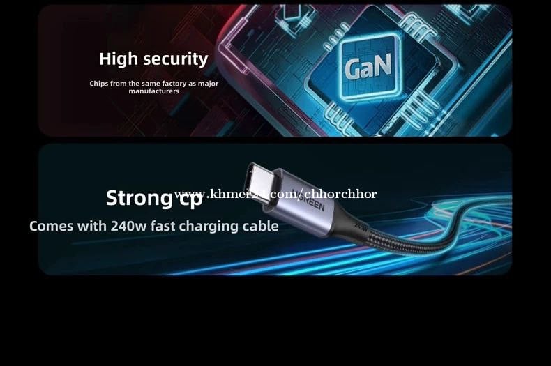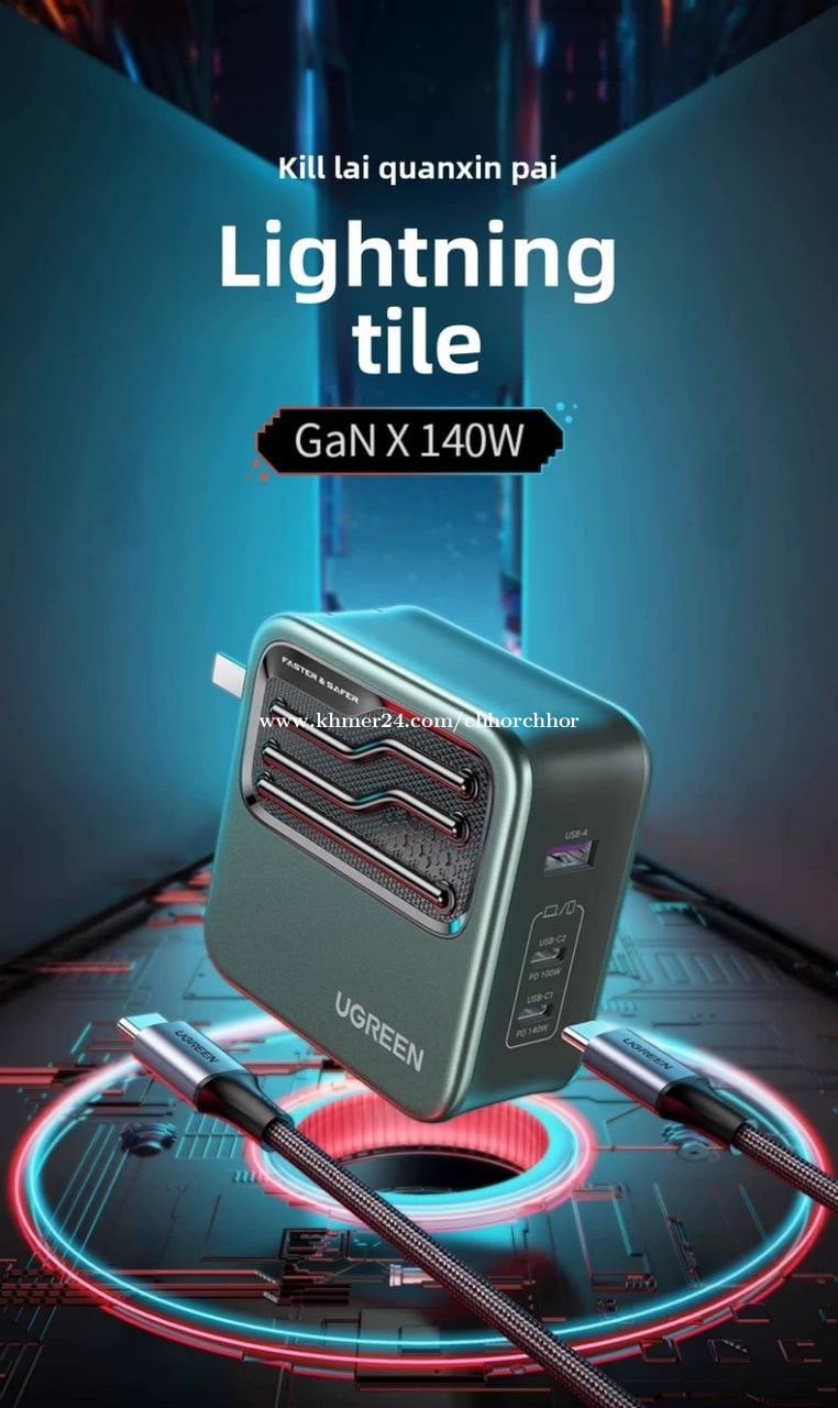 Ugreen Charger140w សាកបានទាំងទូរសព្ទ័និងកុំព្យូទ័រកំលាំងសាករហូតដល់140wមានរន្ធសាក៣ USB -Cមាន2និងUSB-Aមានមួយ
