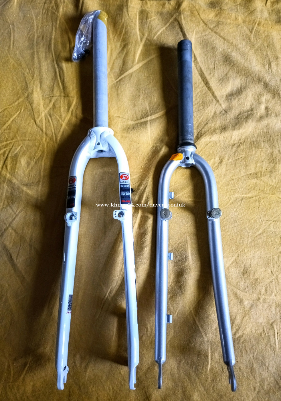Two brand new aluminum V-brake forks. Size best for 26 or 700c. Both come with V-brake mounting pins. The larger Mosso also has a disc brake mount. Price: one, $35.00 both, $55.00 Free delivery in Phnom Penh ហ្វ្រាំង V-brake អាលុយមីញ៉ូមថ្មីពីរ។ ទំហំល្អបំផុតសម្រាប់ 26 ឬ 700c ។ ទាំងពីរនេះភ្ជាប់មកជាមួយម្ជុលម៉ោនហ្វ្រាំង V ។ Mosso ធំជាងនេះក៏មានឧបករណ៍ចាប់ហ្វ្រាំងឌីសផងដែរ។ តម្លៃ៖ មួយ $35.00 ទាំងពីរ $55.00 ដឹកជញ្ជូនឥតគិតថ្លៃក្នុងក្រុងភ្នំពេញ