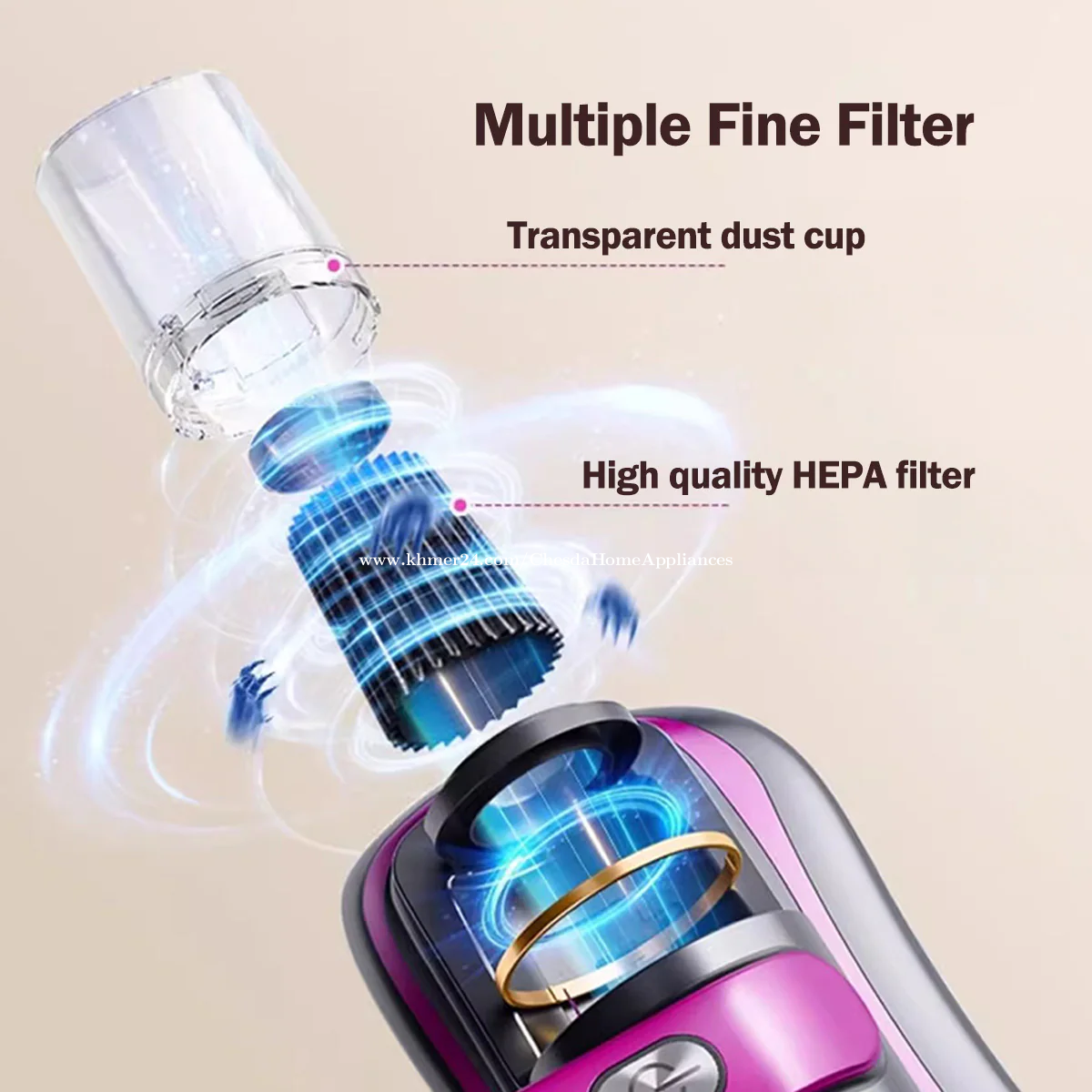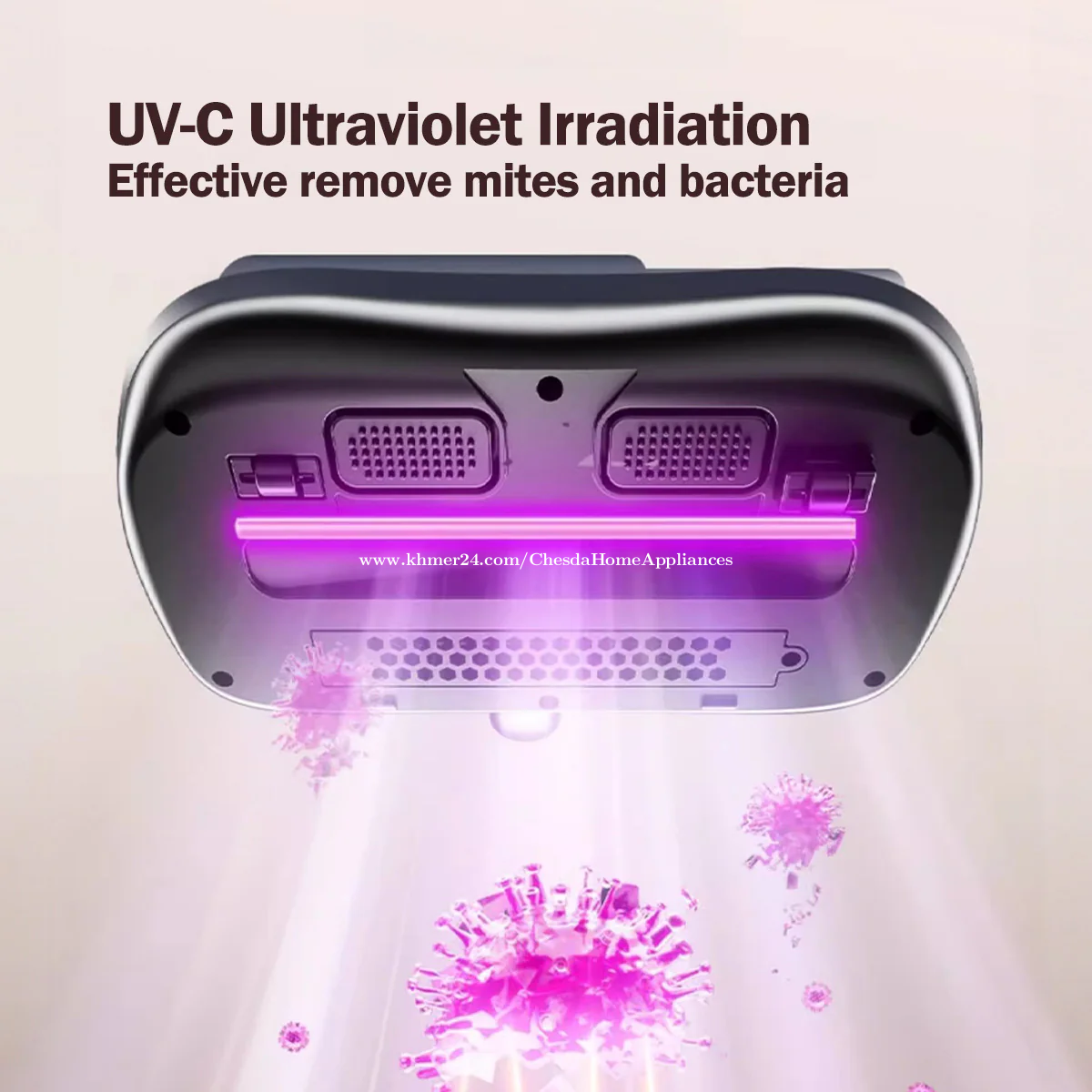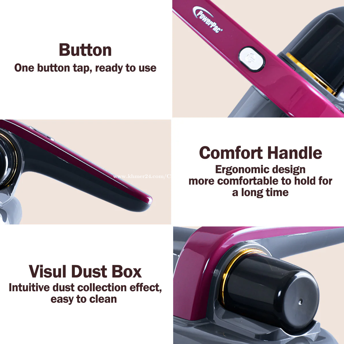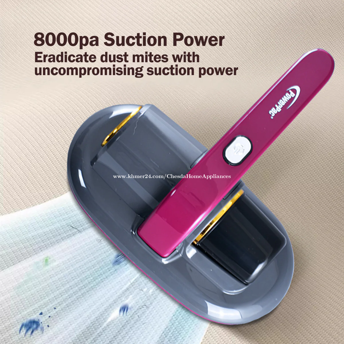 ម៉ាស៊ីនបូមធូលីឥតខ្សែ មានកម្លាំងបឺត 8000 Pa ដែលផ្តល់នូវការសម្អាតពូក វាំងនន កំរាលព្រំ សាឡុង និងកៅអីបរិភោគអាហារយ៉ាងជ្រៅ និងហ្មត់ចត់។ វាបឺតធូលី និងសារធាតុអាលែហ្សីទៅក្នុងតម្រង HEPA (High-Efficiency Particulate Air) ដែលធានាថា មេរោគធូលី រួមជាមួយដង្កូវ និងលាមក ផ្សិត សត្វ ឬសត្វចិញ្ចឹម លំអង និងសារធាតុអាលែហ្សីផ្សេងទៀតត្រូវបានចាប់ជាប់ហើយ ពន្លឺអ៊ុលត្រាវីយូឡេ UV-C ជ្រៀតជ្រែក និងបំផ្លាញអាស៊ីត nucleic នៃបាក់តេរី មេរោគ និងអតិសុខុមប្រាណផ្សេងទៀតយ៉ាងឆាប់រហ័ស ហើយមានសុវត្ថិភាពចំពោះមនុស្ស និងសត្វចិញ្ចឹម។ ដោយសារតែវាគ្មានខ្សែ អ្នកមិនចាំបាច់ដោត និងផ្តាច់ម៉ាស៊ីនបូមធូលីជាប្រចាំនោះទេ នៅពេលអ្នកផ្លាស់ទីជុំវិញផ្ទះ ពីបន្ទប់ទទួលភ្ញៀវទៅបន្ទប់គេង។ The PowerPac Cordless Dust Mite Vacuum Cleaner has a powerful 8000 Pa suction pressure that provides deep and thorough cleaning of mattresses, curtains, carpets, sofas and dining chairs. It suctions dust and allergens into a HEPA (High-Efficiency Particulate Air) Filter, which ensures that dust mites along with their larvae and faeces, mould, animal or pet dander, pollen and other allergens are caught and trapped! Ultraviolet UV-C light interferes and destroys the nucleic acids of bacteria, viruses and other microbes very quickly and is safe to humans and pets. Because it is cordless, you do not have to constantly plug and unplug the vacuum cleaner as you move around the house, from the living room to the bedrooms.