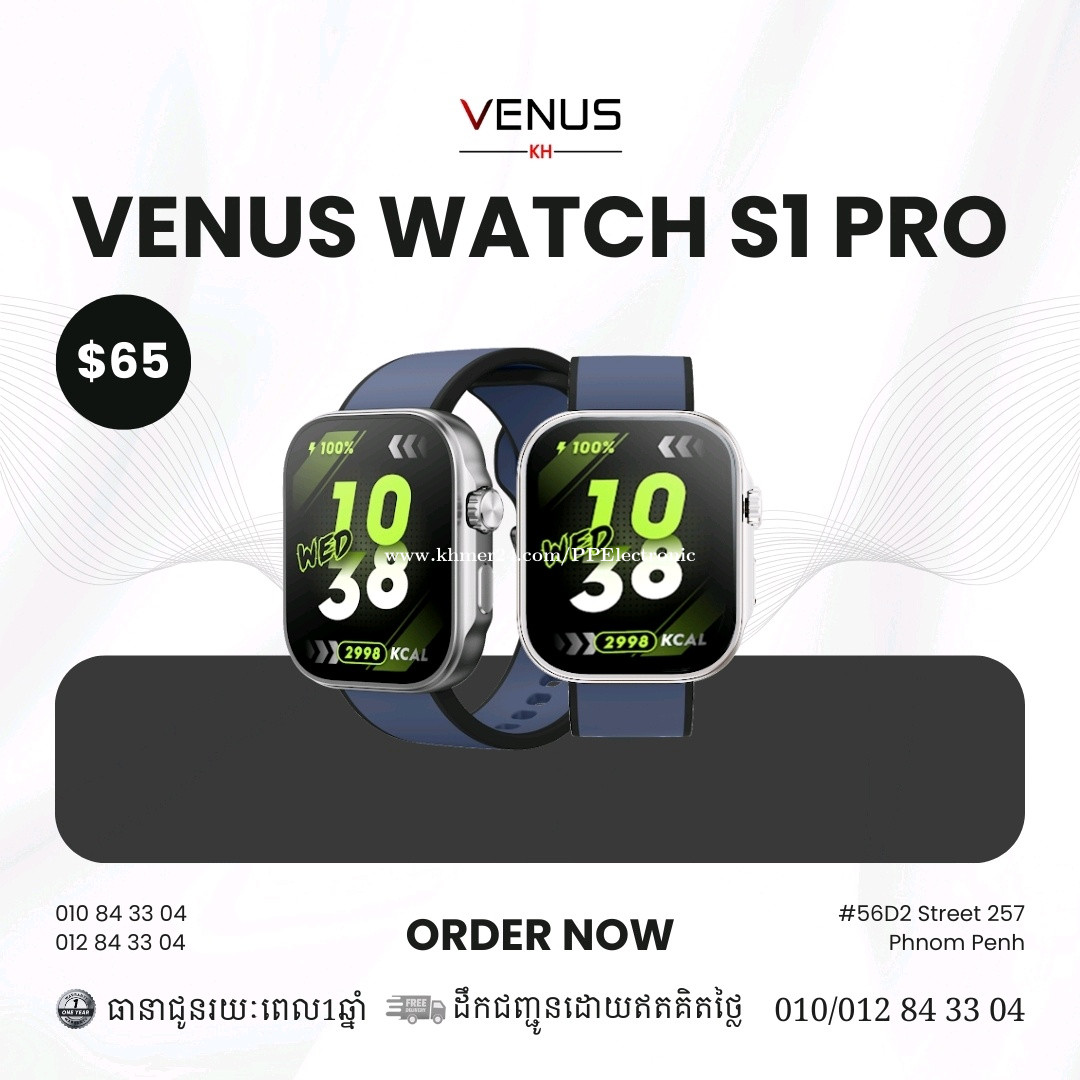 នាទ្បិកាឆ្លាតវៃ Venus Watch S1 Pro ទើបនឹងមកដល់ថ្មី❗️ រូបរាងទំនើប ទាន់សម័យ អេក្រង់លាតធំ ពន្លឺភ្លឺច្បាស់ម៉ត់ មានមុខងារច្រើន គុណភាពល្អទ្វេដង កម្លាំងថ្មធំ ជាពិសេសមានមុខងារវាស់សម្ពាធឈាម អាចប្រើប្រាស់អក្សរខ្មែរបាន និងមានប្រព័ន្ធការពារជម្រាបទឹករហូត 5ATM ដែលអាចប្រើបានគ្រប់កាលៈទេសៈ😍 មាន2ពណ៌សម្រាប់ជ្រើសរើស ⚫️ពណ៌ខ្មៅ ⚪️ពណ៌ប្រាក់ 💲បញ្ជាទិញឥឡូវនេះដើម្បីទទួលបានតម្លៃពិសេស 🛵ដឹកជញ្ជូនដោយឥតគិតថ្លៃទូទាំងប្រទេស 🛡ធានារយៈពេល 1 ឆ្នាំ 🔘 លក្ខណៈពិសេស៖ - អេក្រង់ 1.99 inch AMOLET - មុខងារ Bluetooth Calling - ល្បឿនអេក្រង់ 60Hz - មុខងារ Always On Display - មុខងារតាមដានសុខភាពជាប្រចាំថ្ងៃ - មុខងារវាស់កម្រិតអុកស៊ីសែនក្នុងឈាម - មុខងារវាស់ចង្វាក់បេះដូង - មុខងារតាមដានដំណេក - មុខងារ Blood pressure - មុខងារតាមដានស្រ្តេស - មុខងារ Cycle Tracking - មុខងារតាមដានការដកដង្ហើម - មុខងារកីទ្បាមានជាង100ប្រភេទ - មុខងារ Sport Records - មុខងារAI Voice - កម្មវិធីកំណត់ ( កំណត់ម៉ោងរោទិ៍, Stop Watch , Timer ) - មុខងារបង្ហាញអាកាសធាតុ - អាចផ្លាស់ប្ដូរនិងស្ដាប់តន្ត្រី - មុខងារបញ្ជាកាមេរ៉ា - មុខងារស្វែងរកទូរស័ព្ទ - ម៉ាស៊ីនគិតលេខ - អាចតាំងរូបនិងផ្លាស់ប្តូររូបលើអេក្រង់នាទ្បិកាបានច្រើនប្រភេទ - មានហ្គេមលេង 2ប្រភេទ - អាច Apply theme លើនាទ្បិកាបាន - ផ្លាស់ប្ដូរកម្មវិធីលើនាទ្បិកាបាន3ប្រភេទ - មុខងារផ្ដល់សារដំណឹងពី Message ,Facebook, Messenger, Telegram និងមានមុខងារជាច្រើនទៀត - ប្រព័ន្ធការពារជម្រាបទឹកកម្រិត 5ATM អាចចុះទឹកបានជម្រៅ 50 ម៉ែត្រ - ថ្មអាចប្រើបាន 8-10ថ្ងៃ អាស្រ័យលើការប្រើមុខងារ - អាចភា្ជប់បានគ្រប់ទូរស័ព្ទ Android &IOS - ដំណើរការដោយ App “ Very Fit “ ☎️ ទំនាក់ទំនង: 010843xxxClick To Call (Smart) / 012843xxxClick To Call (Cellcard) 🏢 អាសយដ្ឋាន : ផ្ទះលេខ 56D2 ផ្លូវ 257 បឹងសាឡាង ទួលគោក ភ្នំពេញ Telegram: https://t.me/PP_Eletronic_011
