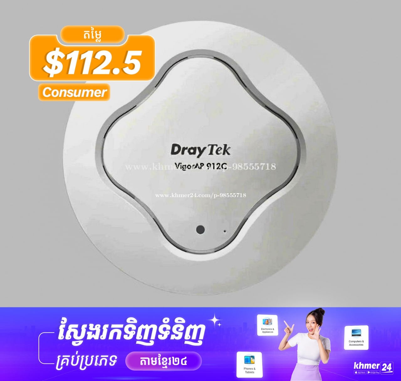 VigorAP912C | Mesh Access Point | DrayTek Mesh Access Point Pro Series- Wireless App: VigorAP (Adroid/IOS 802.11ac Wave 2 Mesh access point - Ports: Single Gigabit PoE+ port - Performance: Supports up to 256 users - Features: Mesh, VLAN, band steering, hotspot portal, RADIUS សូមទំនាក់ទំនងមកកាន់ប្រអប់សារ ឬលេខទូរស័ព្ទ ☎️ 099555xxxClick To Call ☎️ 098555xxxClick To Call 📲 https://t.me/SL718