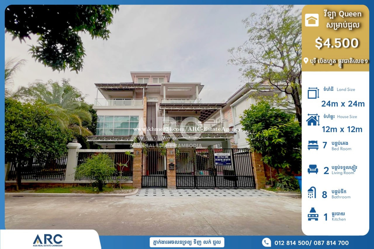 🏡បុរីប៉េងហួតបឹងស្នោរ ផ្លូវជាតិលេខ១ 【#金边独栋别墅出租】#一号路炳发城 Villa Queen For Rent | 别墅大号出租 🔹 Rent Price | 租金: $4.500 (可协商) 🔹 House size| 建筑面积: 12m x 12m 🔹 land size | 土地面积: 24m x 24m 🔹 Bedroom | 房间: 07 🔹 Bathroom | 卫生间: 08 🔹 fully furnished|家具齐全 ✅ 📍 ទីតាំងត្រឹមតែ03នាទីពី ទីក្រុងរណបកោះពេជ្រនឹងកោះនរា បរិយាកាសល្អ សម្រាប់ពត៏មានបន្ថែមសូមទំនាក់ទំនងមកលេខទូរស័ព្ទ 👇 ☎️012814xxxClick To Call | 087814xxxClick To Call | 096493xxxClick To Call 4 Telegram : https://t.me/interested_call_me Channel : https://t.me/ARC_Chbar_am_Pov #villaforrent #ផទះជួល #ChbarAmPo #shophousesale #Houserental #shophousesale #បេងហ៊ួងបឹងស្នោរ