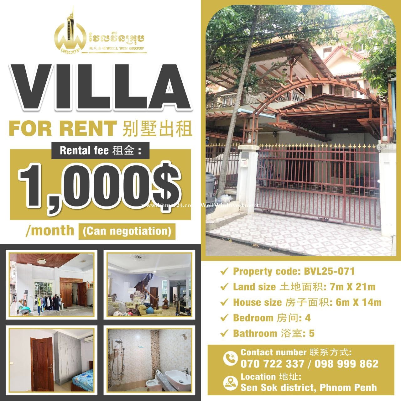 Villa for rent Property code: BVL25-071 Rental 租金:1,000$ (Can negotiation) Land size 土地面积:7m × 21m House size 房子面积; 6m × 14m Bedroom 房间: 4 Bathroom 浴室:5 Location 地址: Sen Sok district, Phnom Penh Contact number 联系方式: 070722xxxClick To Call / 098999xxxClick To Call