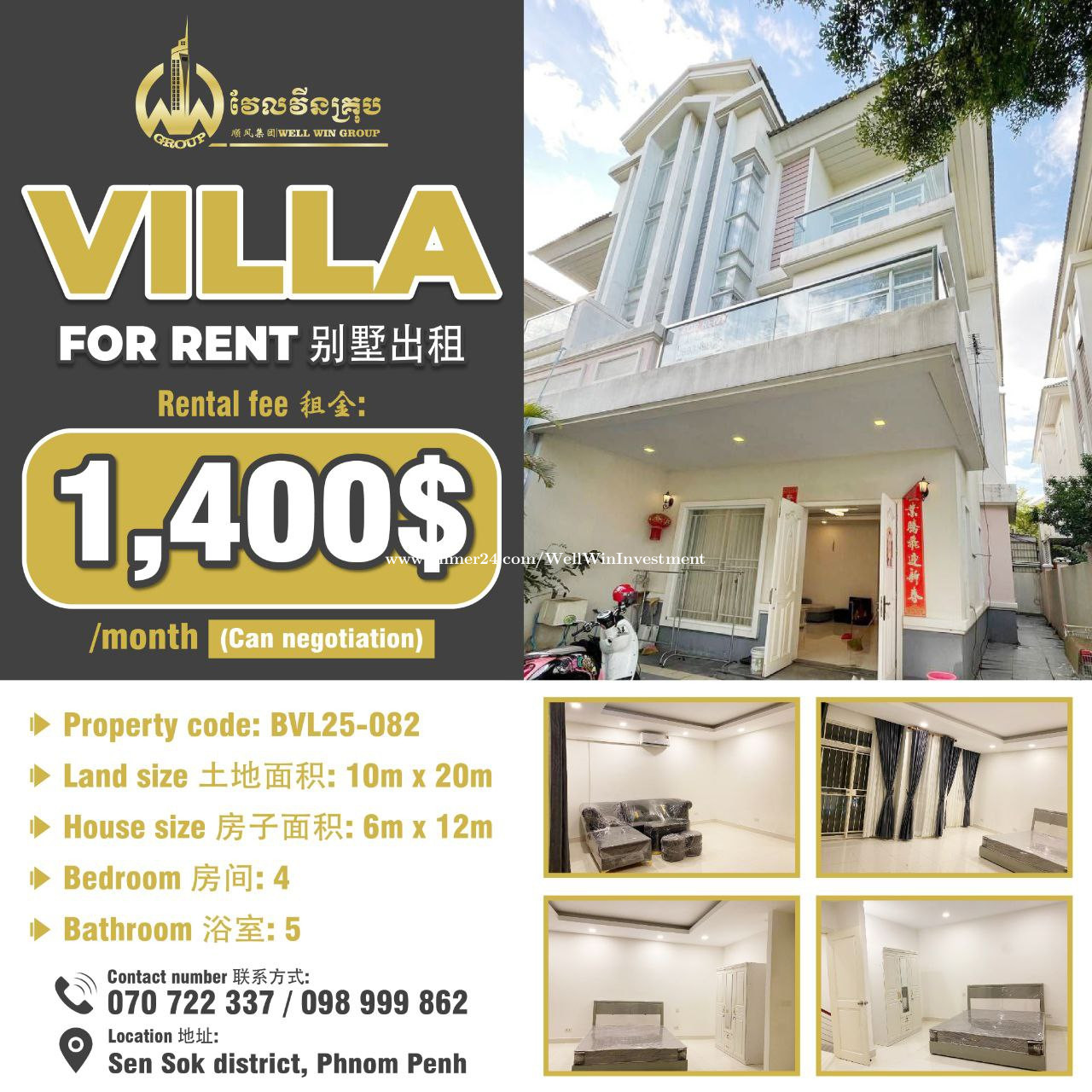 Villa for rent Property code: BVL25-082 Rental 租金: 1,400$ (Can negotiation) Land size 土地面积: 10m x 20m House size 房子面积; 6m x 12m Bedroom 房间: 4 Bathroom 浴室:5 Location 地址: Sen Sok district, Phnom Penh Contact number 联系方式: 070722xxxClick To Call /098999xxxClick To Call