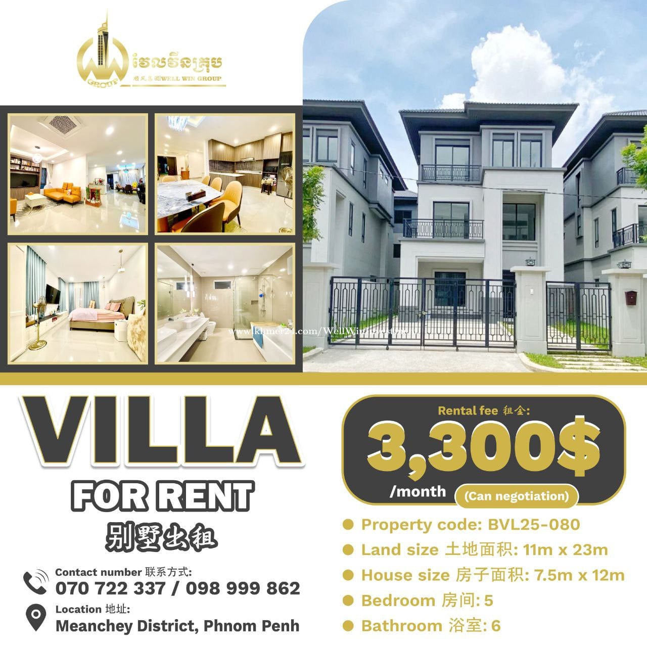 Villa for rent Property code: BVL25-080 Rental 租金: 3,300$ (Can negotiation) Land size 土地面积: 11m x 23m House size 房子面积; 7.5m x 12m Bedroom 房间: 5 Bathroom 浴室:6 Location 地址: Meanchey District, Phnom Penh Contact number 联系方式: 070722xxxClick To Call /098999xxxClick To Call