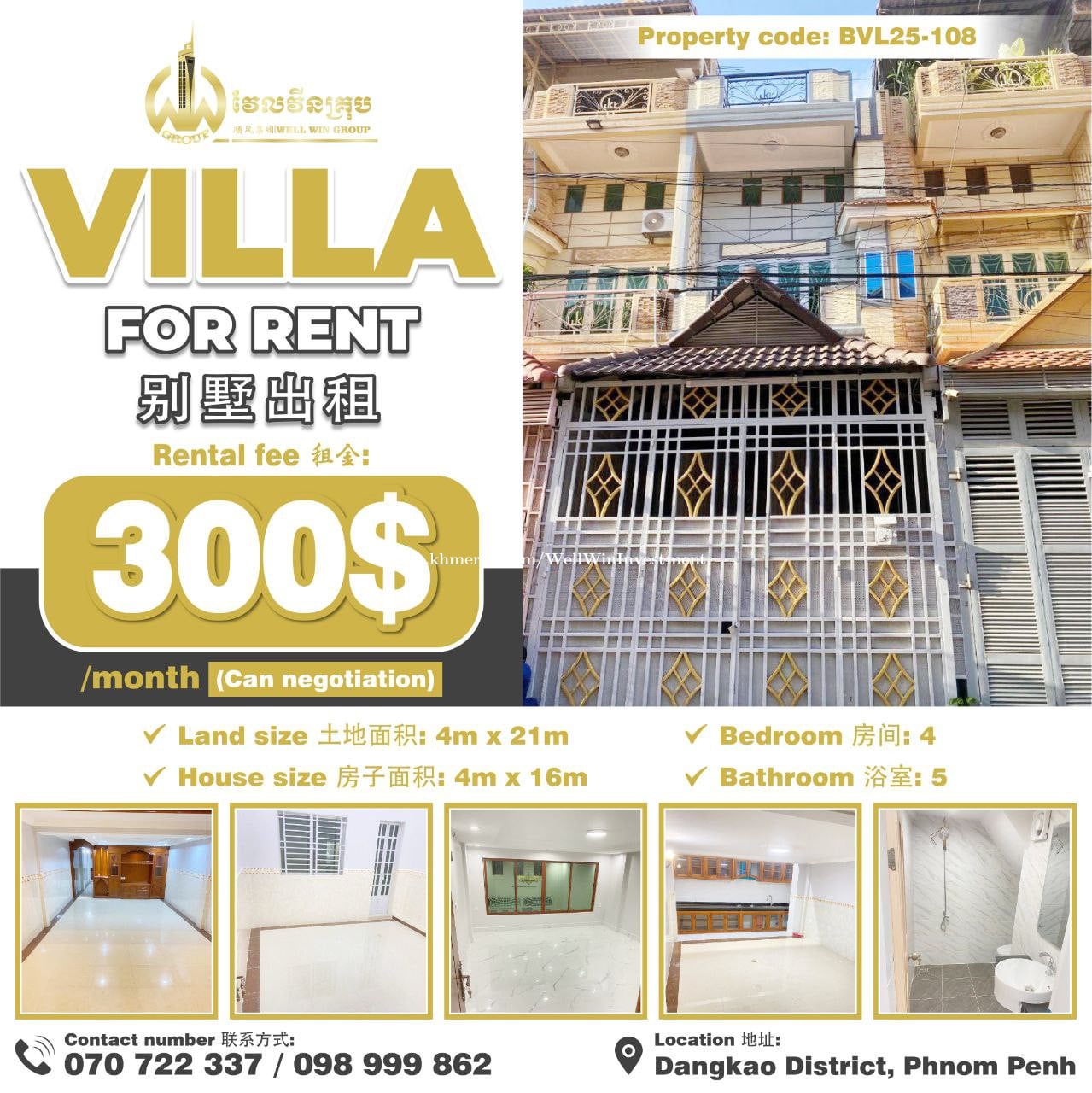 Villa for rent Property code: BVL25-108 Rental 租金: 300$/month (Can Negotiate) Land size 土地面积: 4m x 21m House size 房子面积: 4m x 16m Bedroom 房间: 4 Bathroom 浴室: 5 Location 地址: Dangkao District, Phnom Penh Contact number 联系方式: 070722xxxClick To Call / 098999xxxClick To Call