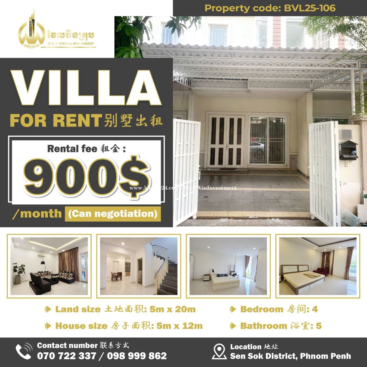 Villa for rent Property code: BVL25-106 Rental 租金: 900$/month (Can Negotiate) Land size 土地面积: 5m x 20m House size 房子面积:5m x 12m Bedroom 房间: 4 Bathroom 浴室: 5 Location 地址: Sen Sok District, Phnom Penh Contact number 联系方式: 070722xxxClick To Call / 098999xxxClick To Call