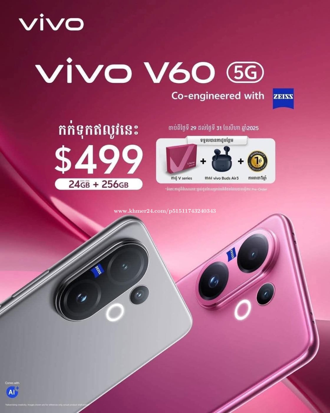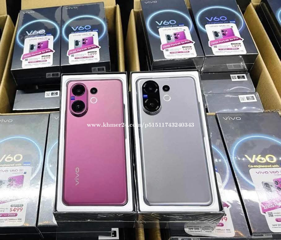 មានលក់ហើយ vivo V60 5G តម្លៃ 499$ 🎁ថែមជូន: កាស vivo Buds Air3 / កាដូ V series ✅បំពាក់មកជាមួយChip Snapdragon 7 Gen4 ✅RAM 24GB / ROM 256GB ✅ប្រព័ន្ធមុខងារពិសេស A.I. ✅ឆ្នាំងសាកល្បឿនលឿន90W ✅ទំហំថ្មធំ. 6500mAh ✅អេក្រង់ទំហំ6.77inch OLED quad-curved 120Hz ✅ប្រព័ន្ធការពារទឹកនិងធូលី IP68&IP69 ✅កាំមេរ៉ាទំហំ50MP (IMX766) OIS + Periscope 50MP (IMX882) 1/1.95 OIS + 8MP wide angle