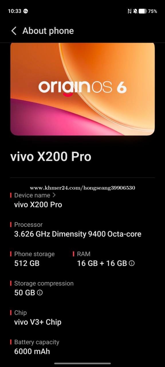Ram : 16G+16G -Rom : 512G -Version : global version -Chip : Dimensity 9400 -Battery : 6000mAh -Accessory : ឆ្នាំងសាកសុីន ប្រអប់សុីន នឹង case 3 (ទូរស័ព្ទប្រើផ្ទាល់ខ្លួន)