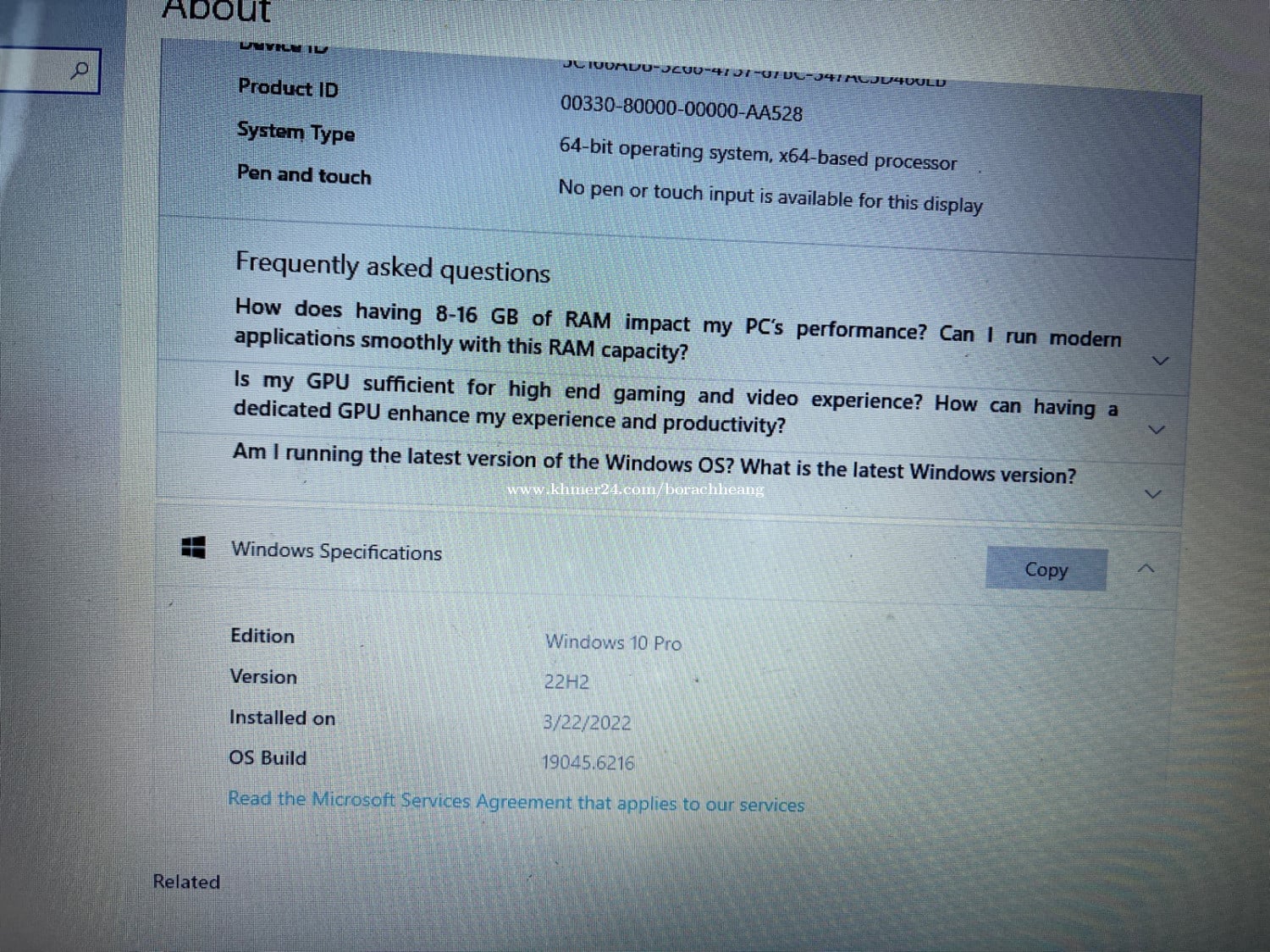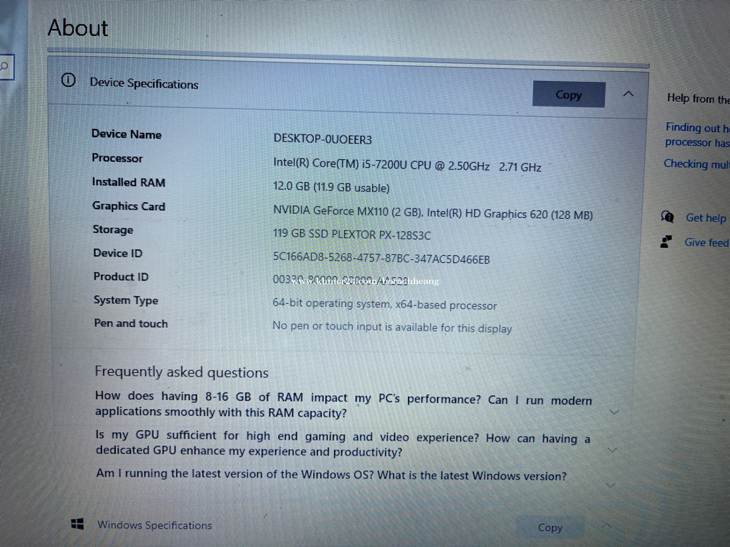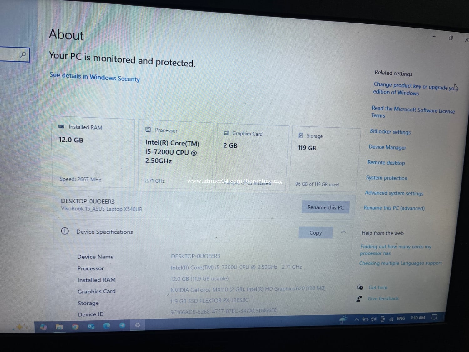 Model : Vivobook 15_Asus Laptop X540UB Ram: 12 GB Storage: 119 GB Processor: Intel(R) Core(TM) i5-7200 CPU @ 2.50Ghz 2.71Ghz Graphic: NVIDIA Geforce MX110 (2 GB) Intel(R) HD Graphics 620 (128 MB) System: 64bit, x64-based processor Windows 10 Pro Laptop ប្រើខ្លួនឯង បើកដំណើរការលឿន Ram 12G ថ្មី 95% បើបងប្អូនចាប់អារម្មណ៍អាចទាក់ទងបាន 087497xxxClick To Call(telegram) អាចចរចាបាន
