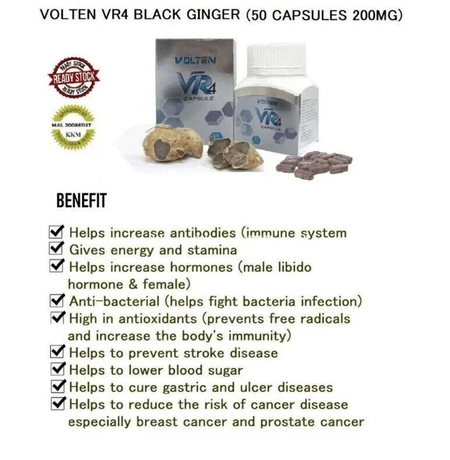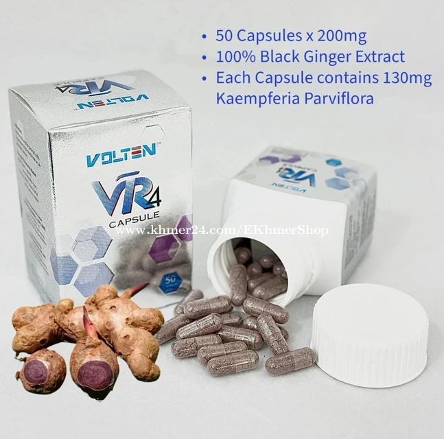 ដឹកជូនជិតឮពីទីតាំងខ្ញុំ នឹង អាចផ្ញើតាមខេត្ត Free delivery near near from my location call/telegram/WhatApps : 016998xxxClick To Call Location: https://maps.app.goo.gl/FXmsUYinLKz4J9HG6 Telegram: https://t.me/ekhmershop VOLTEN VR4 Capsule Black Ginger Extract General Health Energy Booster 50's BENEFITS Helps increase antibodies (immune system) Give energy and stamina Helps increase hormones (male libido hormone & female) Anti-bacterial ( helps fight bacterial infection) High in antioxidants and increase the body's immunity Lower blood sugar INGREDIENTS · Black ginger is also known as 'Thai Ginseng', and by its scientific name, Kaempferia parviflora (KP), which is purple-black in color. Black Ginger is a traditional herb that grows in Southeast Asia, particularly in the mountainous regions of northern Thailand. Black ginger has been used traditionally for over 1000 years in Thailand for general health. It contains Bioflavonoid bioactive substances called Methoxyflavon which helps our body's cells to generate energy. DIRECTION TO USE · Product Usage: · 1 day - 1 pill* _(if there is no illness, it is to take care of health and disease prevention). · 2 days - 4 pills* _(1 pill in the morning and 1 pill in the evening or take 2 pills in the morning or in the evening, for those who have an illness but it has not reached a serious level). · 1 day - 4 pills- 6 pills* _(2 pills in the morning and 2 pills in the evening, for chronic diseases, serious level or those who want faster results).