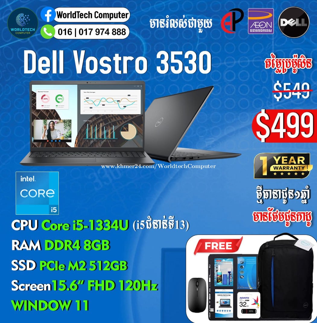 សេរីថ្មី 2025-2026 Dell Vostro 3530 New Warranty 1years i3-1315U RAM 8G M2 512G 15.6" 120Hz New=399$ i3-1315U RAM 16G M2 512G 15.6" 120Hz New=449$ i5-1335U RAM 8G M2 512G 15.6" 120Hz New=499$ i5-1335U RAM 16G M2 512G 15.6" 120Hz New=549$ -ថែមជូនការដូរ 7មុខ និង បិទScreenជូន Telegram: 017974xxxClick To Call , 011777xxxClick To Call ទីតាំងហាង: ផ្ទះ39Eo ផ្លូវ257 ទឹកល្អក់3 ទួលគោក ភ្នំពេញ (ខាងលិចស្តុបទេពផនប្រហែល 300ម)។ Location: #39E0 St257, Tuol Kouk , Tuek L'ak Bei , Phnom Penh