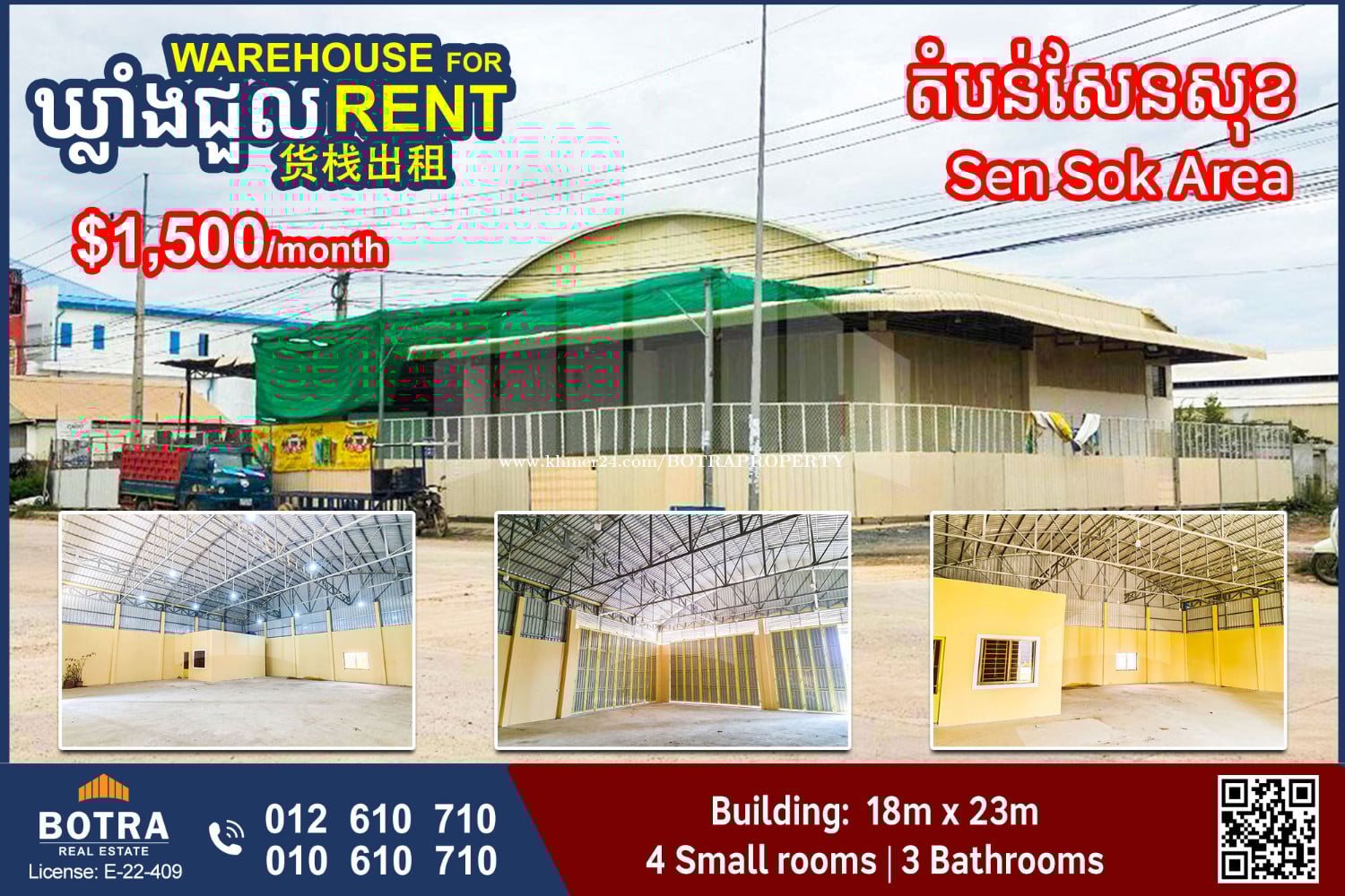 ๐ฃ Warehouse for Rent #P1310 ๐ Location in Sen Sok Area - Size: 18m x 23m - 4 Small rooms | 3 Bathrooms - 1 Office | 1 Meeting room ๐ Price: $1,500/month (nego) โโโโโโโโโ Contact us now ๐ 012610xxxClick To Call (Cellcard) ๐ 010610xxxClick To Call (Smart) โถ๏ธ t.me/BotraRealEstate (Chat)