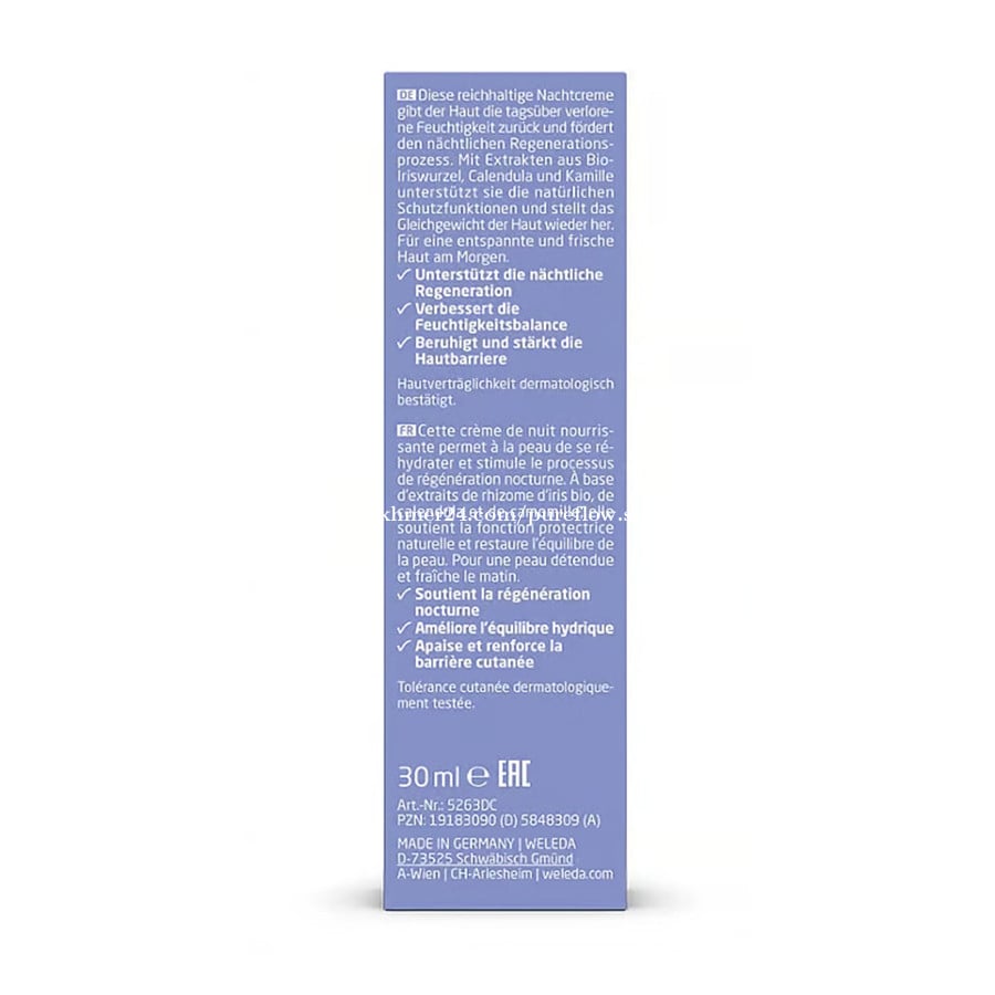 Made in Germany. 100% Natural Ingredients. ផលិតនៅប្រទេសអាល្លឺម៉ង់។ គ្រឿងផ្សំធម្មជាតិ 100%។ 德国制造。100% 天然成分。 Volume: 30ml Product information Give your skin back what it loses during the day. Weleda Iris Night Cream with organic iris root and almond oil encourages it to regenerate overnight. This cream strengthens the skin barrier and prepares it for whatever the next day may bring. Benefits: - Promotes skin regeneration overnight - Provides and retains moisture for a refreshed and revitalized appearance in the morning - Strengthens the skin barrier - With organic iris root and almond oil - NATRUE certified, vegan, dermatologist-verified for skin compatibility ព័ត៌មានផលិតផល ផ្តល់ឱ្យស្បែករបស់អ្នកនូវអ្វីដែលវាបាត់បង់ក្នុងអំឡុងពេលថ្ងៃ។ ក្រែមលាបពេលយប់ Weleda Iris ជាមួយឬសអាយរីសសរីរាង្គ និងប្រេងអាល់ម៉ុន ជំរុញឱ្យវាបង្កើតឡើងវិញពេញមួយយប់។ ក្រែមនេះពង្រឹងរបាំងស្បែក និងរៀបចំវាសម្រាប់អ្វីដែលអាចកើតឡើងនៅថ្ងៃបន្ទាប់។ អត្ថប្រយោជន៍៖ - ជំរុញការបង្កើតឡើងវិញនៃស្បែកពេញមួយយប់ - ផ្តល់ និងរក្សាសំណើមសម្រាប់រូបរាងស្រស់ថ្លា និងរស់រវើកនៅពេលព្រឹក - ពង្រឹងរបាំងស្បែក - ជាមួយឬសអាយរីសសរីរាង្គ និងប្រេងអាល់ម៉ុន - បញ្ជាក់ដោយ NATRUE សម្រាប់អ្នកបួស និងត្រូវបានផ្ទៀងផ្ទាត់ដោយគ្រូពេទ្យជំនាញសើស្បែកសម្រាប់ភាពឆបគ្នានៃស្បែក 产品信息 这款滋润的晚霜可以补充白天流失的水分,促进夜间再生过程。含有机鸢尾根、金盏花和洋甘菊萃取物,可支援天然保护功能并恢复皮肤平衡。 功效: - 促进皮肤夜间再生 - 提供并保持水分,让您早晨精神焕发、神清气爽 - 增强皮肤屏障 - 含有机鸢尾根和杏仁油,散发花香 - 适合所有肤质 - NATRUE 认证,素食,经皮肤科证实与皮肤相容