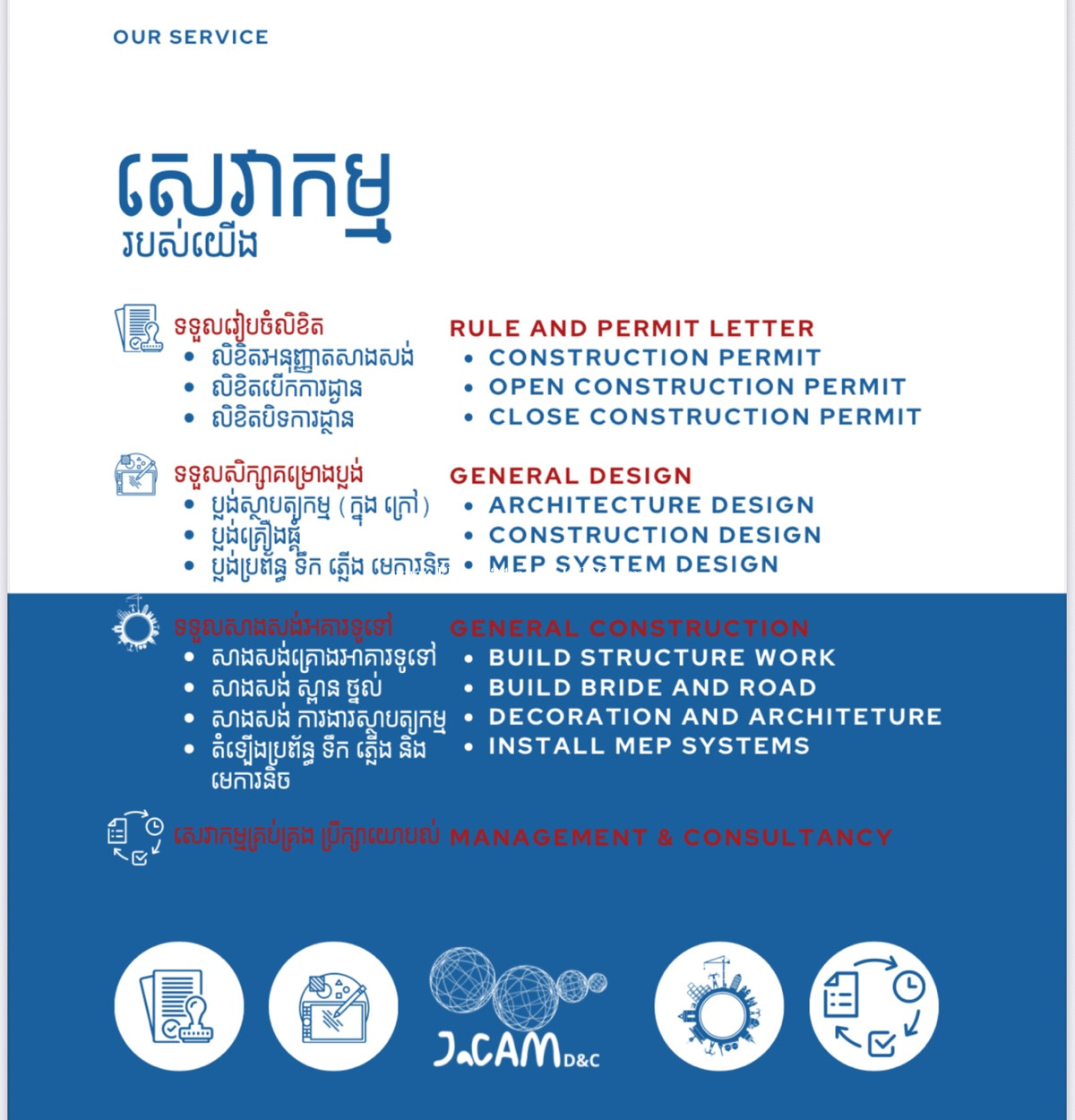 JC Design & Construction Co., Ltd. is a privately owned company established in 2014 in Phnom Penh City, Cambodia. សេវាកម្ម Our Service: - សិក្សារគម្រោងប្លង់ General Design - សាងសង់អគារទូទៅ General Construction - តម្លើង និងសិក្សារប្រព័ន្ធ ទឹកភ្លើង MEP system - រៀបចំលិខិតសាងសង់ General Permits
