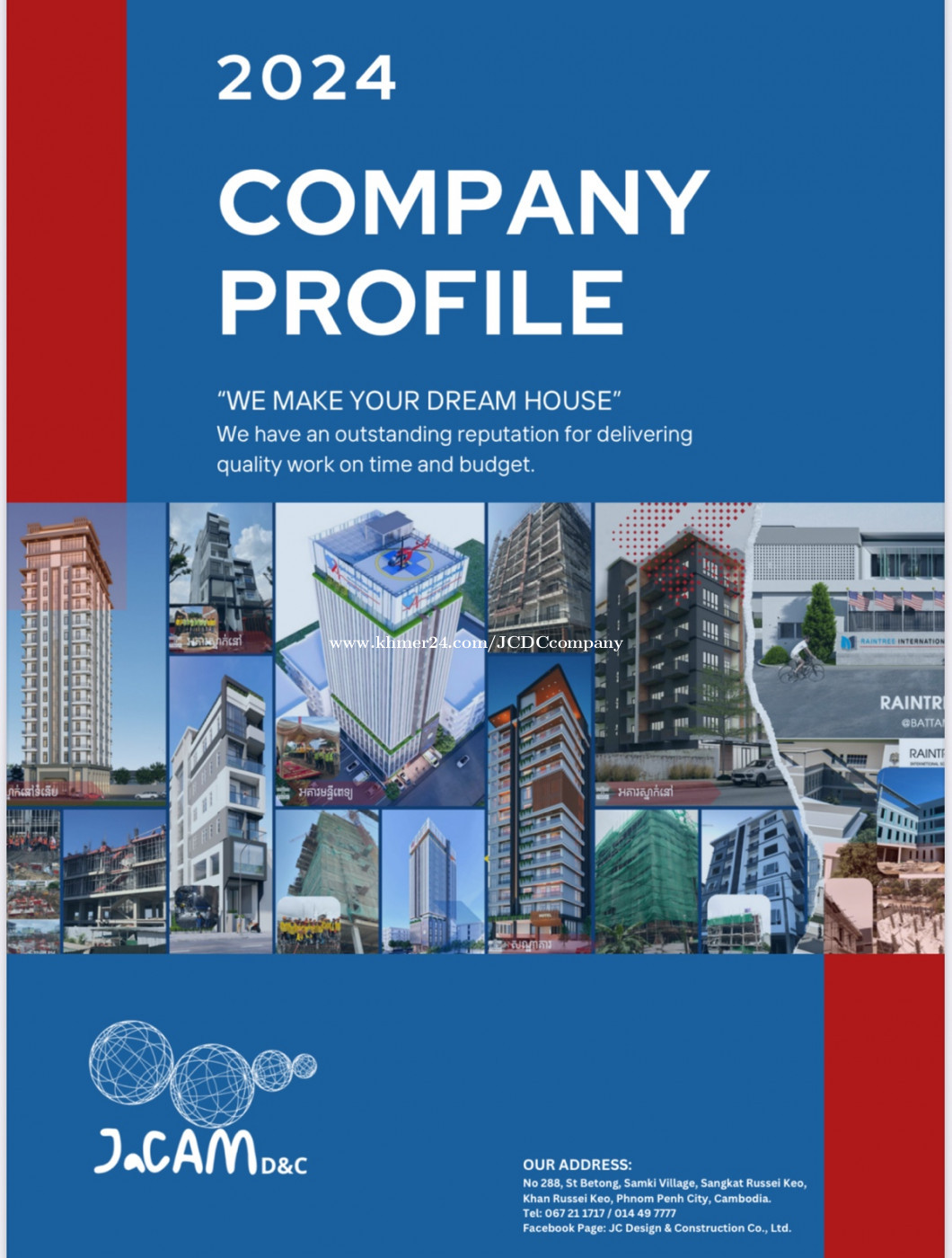 JC Design & Construction Co., Ltd. is a privately owned company established in 2014 in Phnom Penh City, Cambodia. សេវាកម្ម Our Service: - សិក្សារគម្រោងប្លង់ General Design - សាងសង់អគារទូទៅ General Construction - តម្លើង និងសិក្សារប្រព័ន្ធ ទឹកភ្លើង MEP system - រៀបចំលិខិតសាងសង់ General Permits