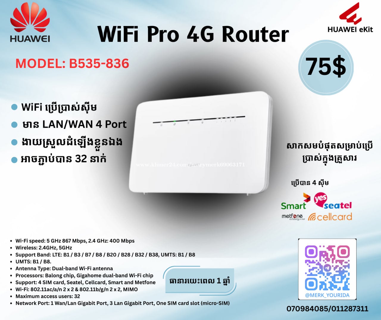Wi-Fi ប្រើសុីម Router ប្រើសម្រាប់គ្រួសារដាក់បាន 4 សុីម Huawei B535-836 ធានារយះពេលមួយឆ្នាំ