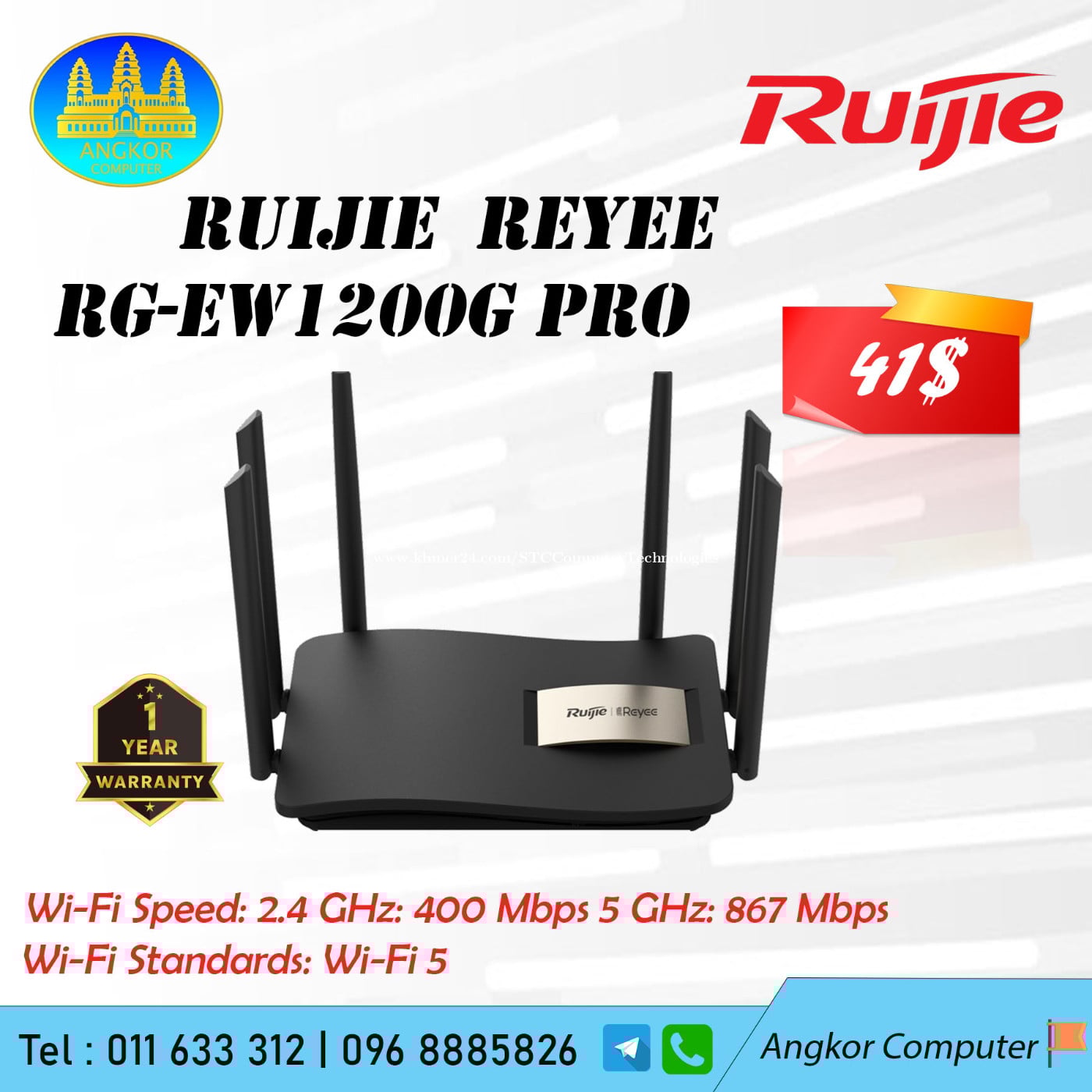 Wireless Router Ruijie RG-EW1200G Pro Wi-Fi Standards: Wi-Fi 5 (802.11ac) អាស័យដ្ឋាន : ផ្ទះលេខ62Eoផ្លូវ 217 ( វិថីហ្សាដឺហ្គោល) កែងនិងផ្លូវ107 ( ផ្លូវសុខហុកអូឬស្សី) ☎️ 011633xxxClick To Call / 0889696xxxClick To Call / 0968885xxxClick To Call https://maps.app.goo.gl/H2V83cjDn3WXQjJD8 https://t.me/Angkor_Computer