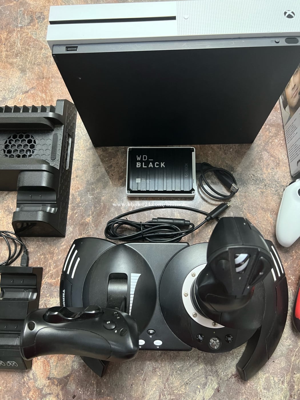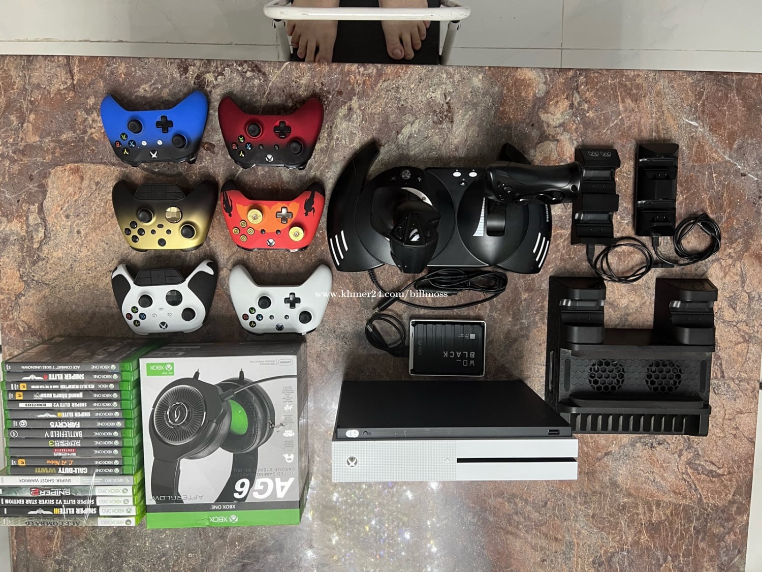 Xbox S 6 rechargeable controllers Cooling station with charger 2 chargers usb HOTAS thrust master flight controller WD Black 1TB storage with multiple games downloaded 17 games (also plays Xbox 360 games) Red Dead Redemtion Ace Combat Call of Duty Sniper Many more installed on console New gaming headphones EVERYTHING WORKS great Will meet location halfway