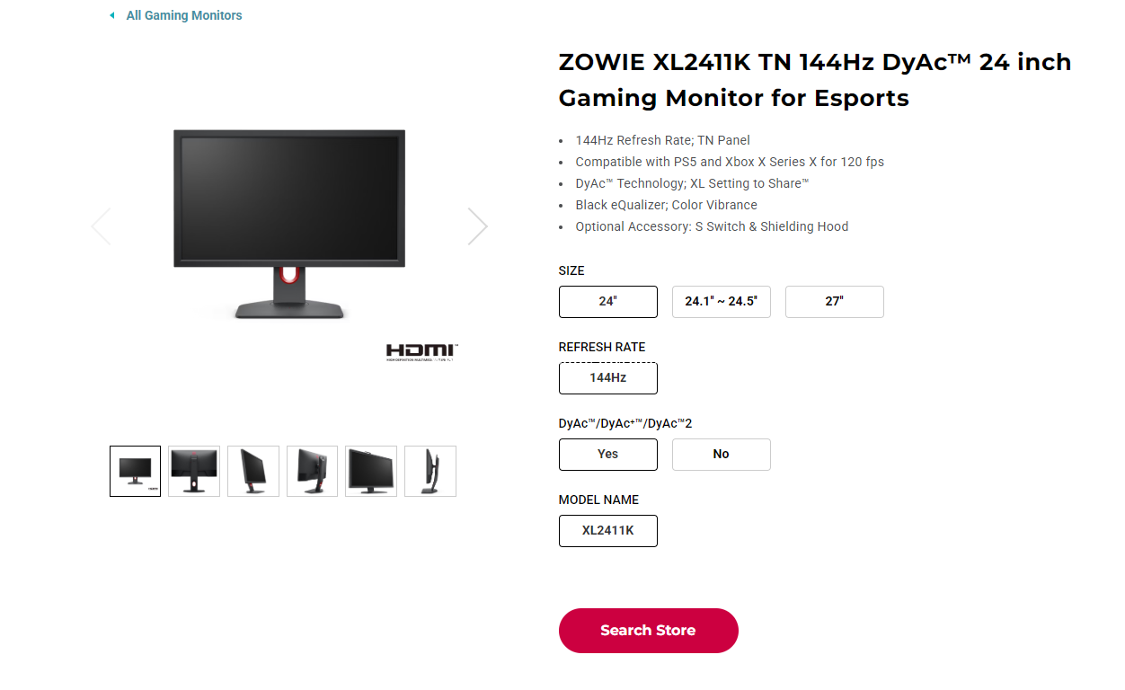 ZOWIE XL2411K TN 144Hz DyAc™ 24-inch Gaming Monitor for Esports (High performance monitor) Display: 24" Full HD Premium Esports Grade TN Panel Monitor 1920 x 1080 resolution,320 nits brightness Connectivity: HDMI 1.4 x 2, HDMI 2.0 x 1, DP 1.2 X 1, Headphone Port x 1. Image Optimization: DyAc, Color Vibrance, XL Setting to Share and Black eQualizer optimize image quality for better gaming experiences. Convenience: S-Switch (optional) for Quick OSD offer easy control, K Locker, Shield (optional) Stand: VESA wall mount provision 100x100 (mm), Pivot, Tilt, Swivel and Height Adjustment Eye Care: Low Blue Light and Flicker Free