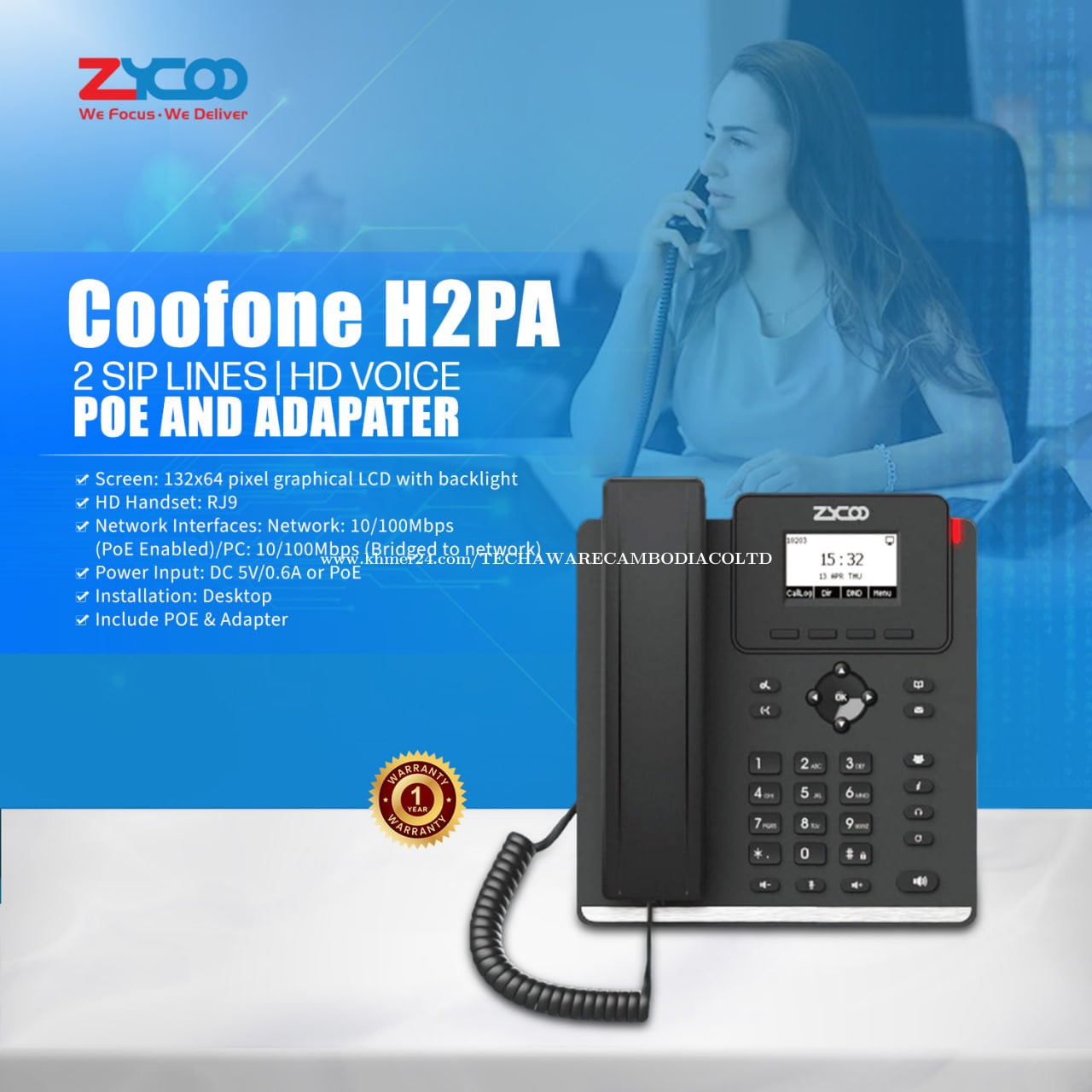 ZYCOO CooFone-H2PA ទូរស័ព្ទលើតុដែលល្អបំផុតសម្រាប់ធ្វើការទំនាក់ទំនងការងារប្រចាំថ្ងៃ ✅ឌីសាញថ្មីស្អាតខ្លាំង ទាន់សម័យ ✅ទូរស័ព្ទលើតុដែលមានគុណភាពសម្លេងលឺច្បាស់ល្អ (HD Voice) ✅ទំហំអេក្រង់(132x64 pixel graphical LCD with backlight) ✅និងអាចកំណត់លេខ Extension បានចំនួន 2លេខ ✅Support POE & Adapter included ✅ធានាជូនរយ:ពេល 1ឆ្នាំ ************************************* Zycoo Coofone H2PA 2 Sip Lines | HD Voice | POE and Adapter -Screen: 132x64 pixel graphical LCD with backlight -HD Handset: RJ9 -Network Interfaces: Network: 10/100Mbps (PoE Enabled)/PC: 10/100Mbps (Bridged to network) -Power Input: DC 5V/0.6A or PoE -Installation: Desktop -Include POE & Adapter -Warranty: 1Year ************************************* ទំនាក់ទំនងមកឥឡូវនេះ ដើម្បីទទួលបាននូវតម្លៃពិសេស និងការដឹកជញ្ជូនឥតគិតថ្លៃ!ផលិតផលសុទ្ធរបស់ក្រុមហ៊ុន 100% រកទិញបាននៅ First Electronics BOREY HONG LAY, Toul PongRo 🏠Address: #85, St.01, Sangkat Prey Sar, Phnom Penh 🎯https://goo.gl/maps/DPQB66KGvaBDYS4V6 ☎️077973xxxClick To Call / 069360xxxClick To Call 012288xxxClick To Call/ 016288xxxClick To Call / 0972288xxxClick To Call ✅https://t.me/chhenghoryan ✅https://t.me/ChhanSopha #FirstElectronics #Zycoo